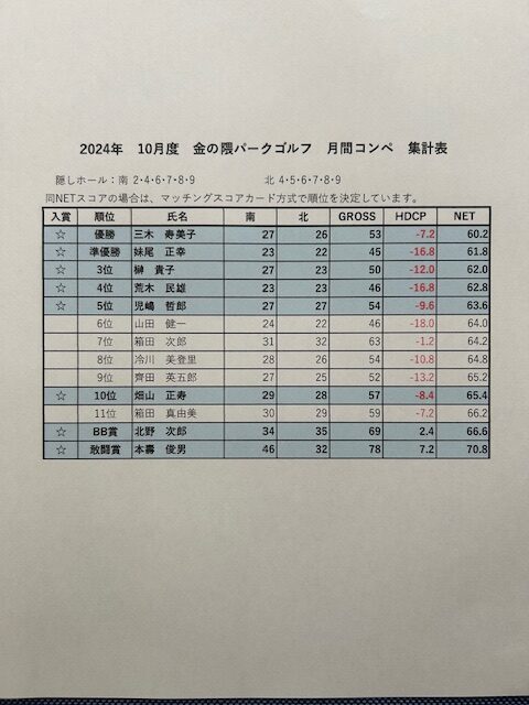 成績は以上の通りになります。入賞(☆印)の方は賞品がございますので、パークゴルフフロントまでお越しください✨