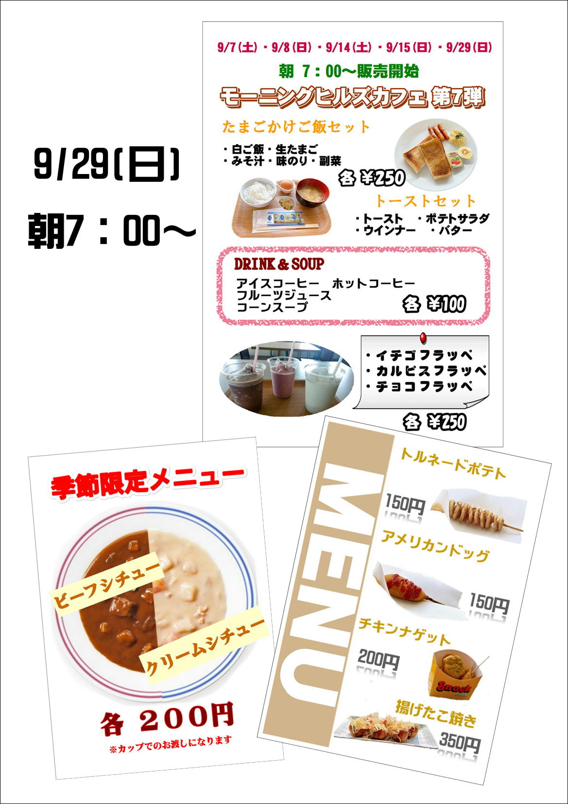 9/29(日) 朝7:00〜 モーニングヒルズカフェ 開催です☕️ 朝かなり涼しくなったので温かいシチューもご用意しております。