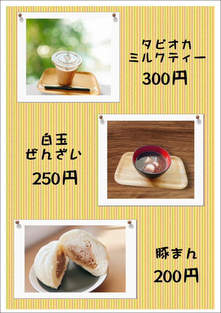 タピオカミルクティー300円、ぜんざい250円、豚まん200円など軽食もご用意しております。