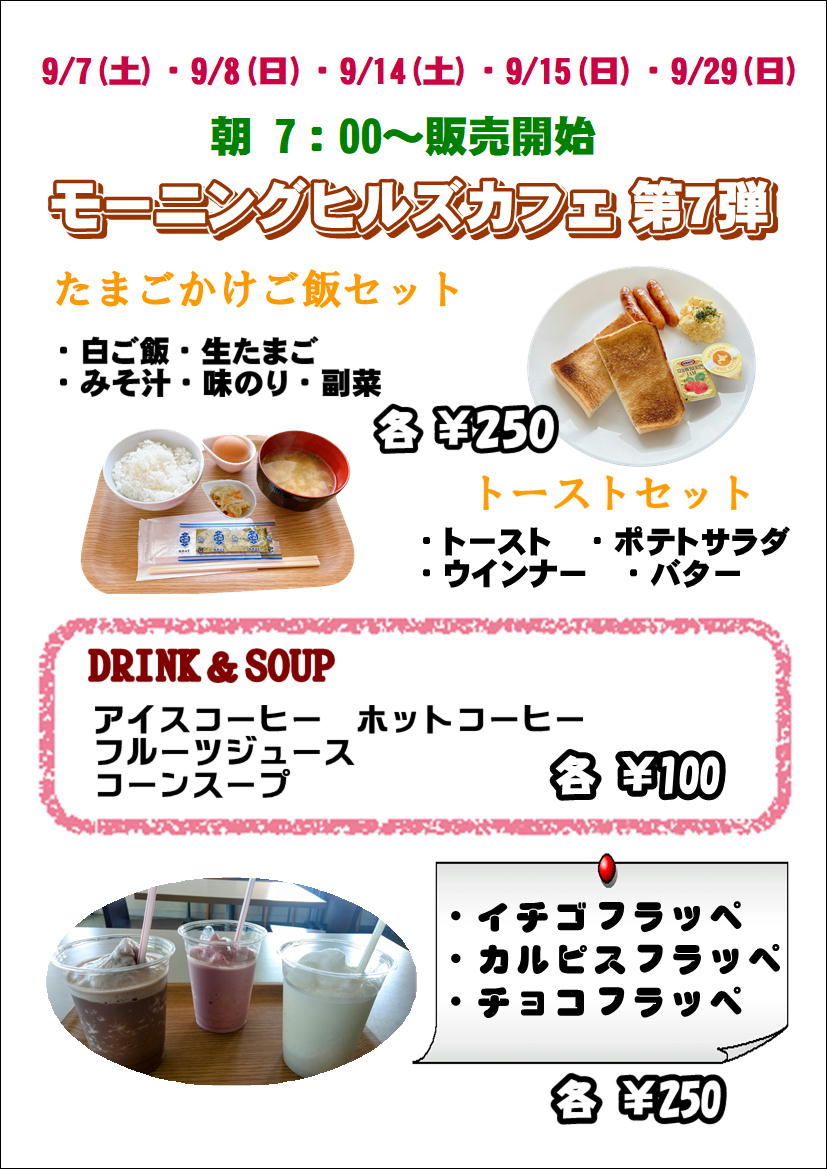 9月のモーニングヒルズカフェ第7弾のお知らせでございます。 開催日は9/7(土)・9/8(日)・9/14(土)・9/15(日)・9/29(日)でございます🥤