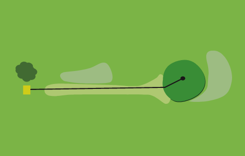 最初のホールは、やや上りで右へ傾斜しています。木の方向に打ち込まないよう注意! フラットなグリーンにワンオンして幸先よくスタートしよう。